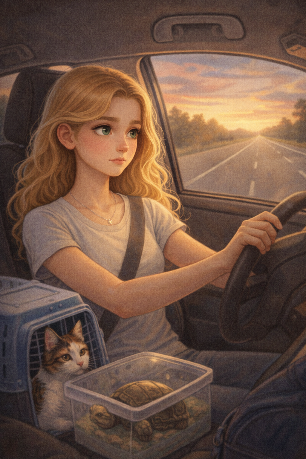 I put my turtle in a container with air holes punched carefully through the lid. My cat rode in a carrier on the passenger seat. A duffel bag in the back. A small stack of clothes. A few things that felt like mine.